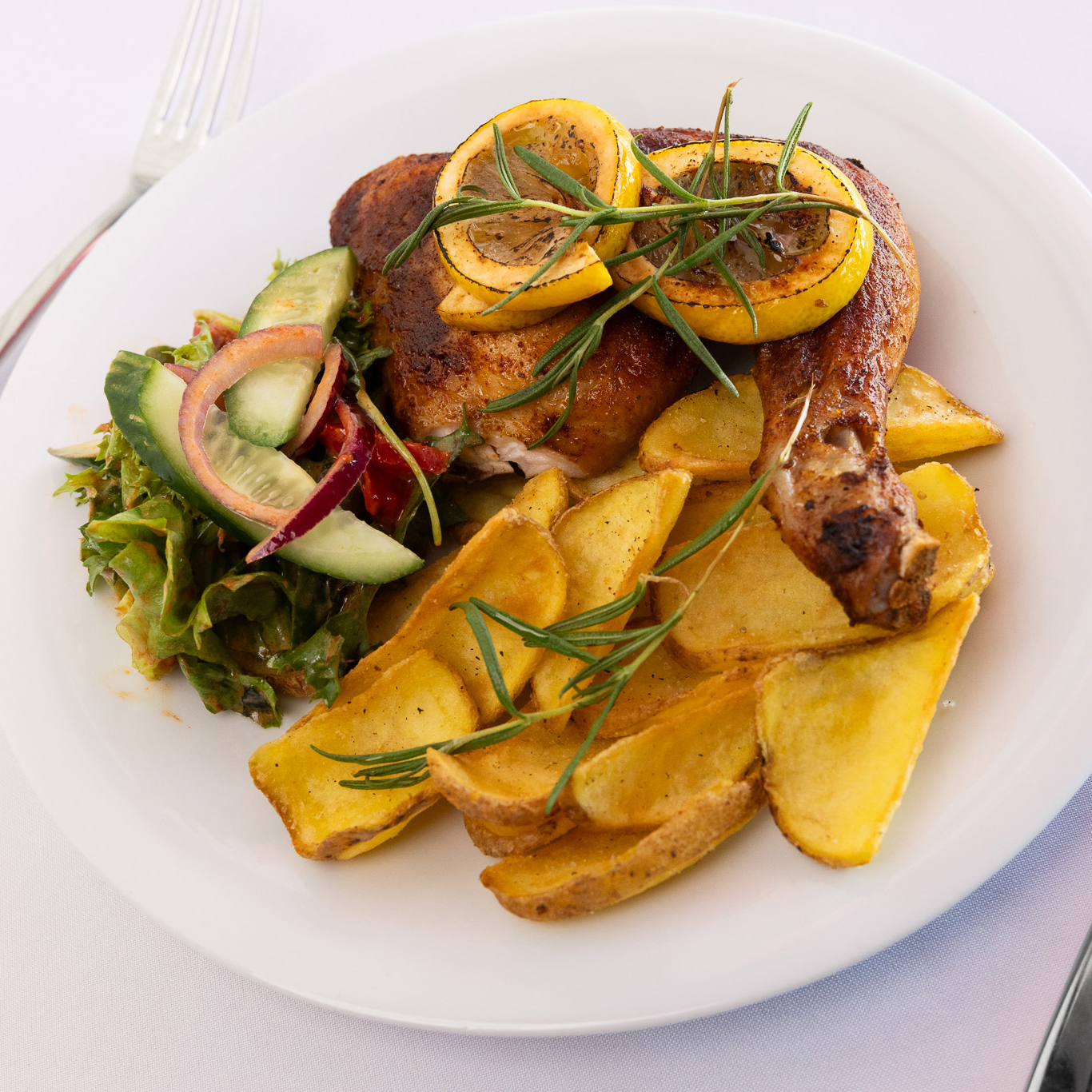 2. Pieczone udko z kurczaka z rozmarynem i cytryną, ziemniaki opiekane, bukiet warzyw z winegret